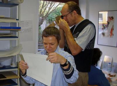 ...kritische Blicke...Omesh mit Lupe: " sind meine Linien tief genug geätzt ?" Barbara voller Zweifel: "nah, wie sieht jetzt mein Druck aus ?"